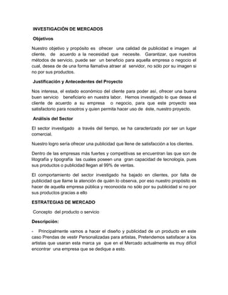 Este documento presenta un proyecto de diseño y publicidad para prendas de vestir personalizadas para artistas. El proyecto incluye un análisis del mercado, estrategias de marketing como precio, promoción, distribución y servicio, y proyecciones de ventas. El objetivo es ofrecer publicidad atractiva para atraer a clientes y hacer que la marca sea reconocida por sus productos personalizados para artistas.
