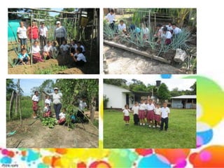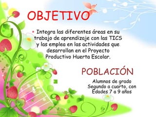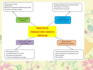 El documento describe un proyecto educativo que utiliza herramientas digitales y una huerta escolar para enseñar a estudiantes de segundo a cuarto grado sobre el medio ambiente y la agricultura. Los estudiantes usan programas como Paint, Pequetic y Word para dibujar planos de la huerta, buscar información y editar textos. También aprenden midiendo el pH del suelo y plantando semillas, y comparten lo que aprenden creando cuentos y presentaciones. El objetivo es que los estudiantes se apropien de las herramientas te