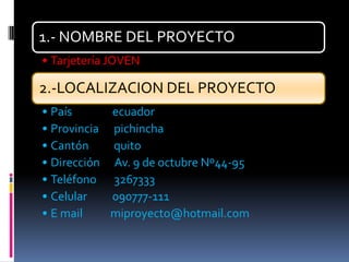 Este documento presenta un proyecto productivo propuesto por un grupo de estudiantes llamado "Juventud Emprendedora" para iniciar una microempresa de tarjetas artísticas. El proyecto busca generar ingresos para las familias de los estudiantes y mejorar su calidad de vida. La microempresa se financiará parcialmente con aportes de los estudiantes y apoyo de su institución educativa. El mercado objetivo son otros estudiantes, profesores y negocios locales.