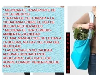 El documento propone el uso de bolsas reutilizables para mejorar el transporte de alimentos, culturizar a la ciudadanía sobre el reciclaje y cuidado ambiental, y reducir el impacto de las bolsas de un solo uso en el medio ambiente. Promueve los beneficios de las bolsas reutilizables como su mayor vida útil, importancia dada a la reutilización y biodegradación más rápida en comparación con las bolsas de un solo uso.