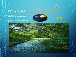 Este documento describe el ciclo del agua. Explica que el agua se mueve continuamente en la naturaleza a través de procesos como la evaporación, la condensación y la precipitación. También destaca la importancia del agua y la necesidad de no malgastarla dado que es un recurso escaso.