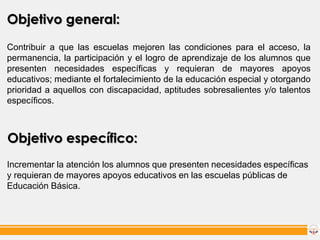 Este documento presenta el Programa de Fortalecimiento de la Educación Especial y de la Integración Educativa. El objetivo general es contribuir a que las escuelas mejoren las condiciones para el acceso, la permanencia, la participación y el logro de aprendizaje de los alumnos con necesidades educativas especiales. El objetivo específico es incrementar la atención a estos alumnos en escuelas públicas de educación básica. El programa realiza acciones como fortalecer marcos normativos e implementar planeaciones anuales de