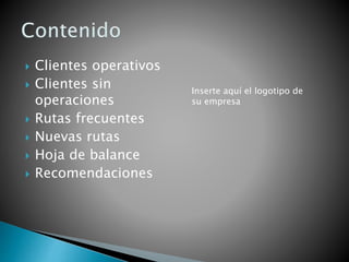 El documento resume la información sobre los clientes operativos y no operativos del mes anterior, las rutas frecuentes y nuevas rutas de la empresa, la hoja de balance del último y este año, y recomendaciones para mejorar los beneficios.