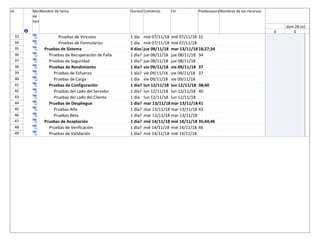 El documento describe 49 tareas de pruebas de software programadas entre el 29 de octubre y el 14 de noviembre. Las tareas incluyen pruebas unitarias, de integración, sistema, aceptación y validación. Algunas tareas dependen de la finalización de otras tareas anteriores.