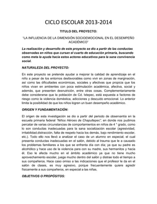 Este proyecto busca ayudar a mejorar el desempeño académico y socioemocional de los niños en una escuela primaria ubicada en una zona marginada. El proyecto evaluará las estrategias del director y docentes, y también incluirá sesiones de terapia psicológica para padres e hijos, convivencias familiares, y talleres de lectura. El objetivo es que los niños, especialmente aquellos con problemas de conducta, mejoren su actitud y habilidades sociales.