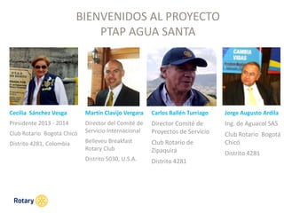 El proyecto PTAP Agua Santa tiene como objetivo potabilizar agua para 5,000 habitantes de comunidades rurales en Colombia, promovido por clubes rotarios locales y de Estados Unidos. Se originó a partir de la necesidad de mejorar el acceso a agua potable en San Antonio del Tequendama y se fundamenta en la experiencia previa del PTAP Don Benito en Zipaquirá. La colaboración busca obtener una subvención global de Rotary International para financiar la iniciativa y asegurar su sostenibilidad a largo plazo.