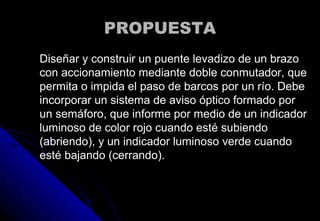 El documento describe un proyecto para diseñar y construir un puente levadizo de un solo brazo, que incluya un mecanismo de acción mediante un motor reductor y un sistema de aviso óptico. Se establecen condiciones de diseño y materiales específicos, así como documentación necesaria para el proyecto, incluyendo planos, lista de materiales y evaluación personal. También se mencionan puentes de referencia y ensayos relacionados.