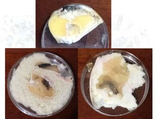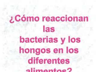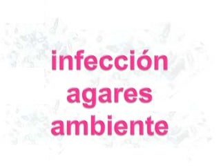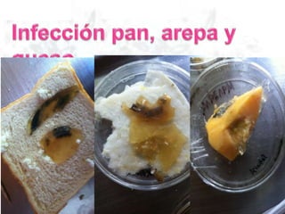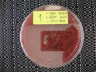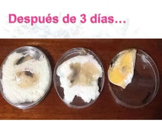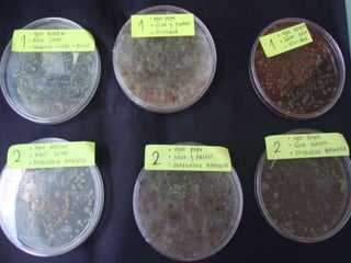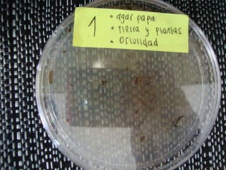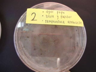Este documento describe diferentes tipos de agar para cultivar bacterias y hongos, incluyendo agar nutritivo, agar de papa y agar de sangre, los cuales se probaron en condiciones de oscuridad y ambiente. También menciona algunos alimentos como manzanas, naranjas, yuca, pan y queso.