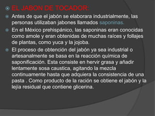 Este documento describe la historia del jabón y el proceso de elaboración de jabón artesanal. Brevemente resume que el jabón se originó hace miles de años y fue usado por civilizaciones antiguas como los sumerios y egipcios. Explica que los romanos lo convirtieron en un artículo de uso diario y su producción decayó tras la caída del Imperio Romano. Más tarde, la fabricación de jabón se expandió por Europa formándose gremios de jaboneros. Finalmente, detalla los pasos para hacer jabón