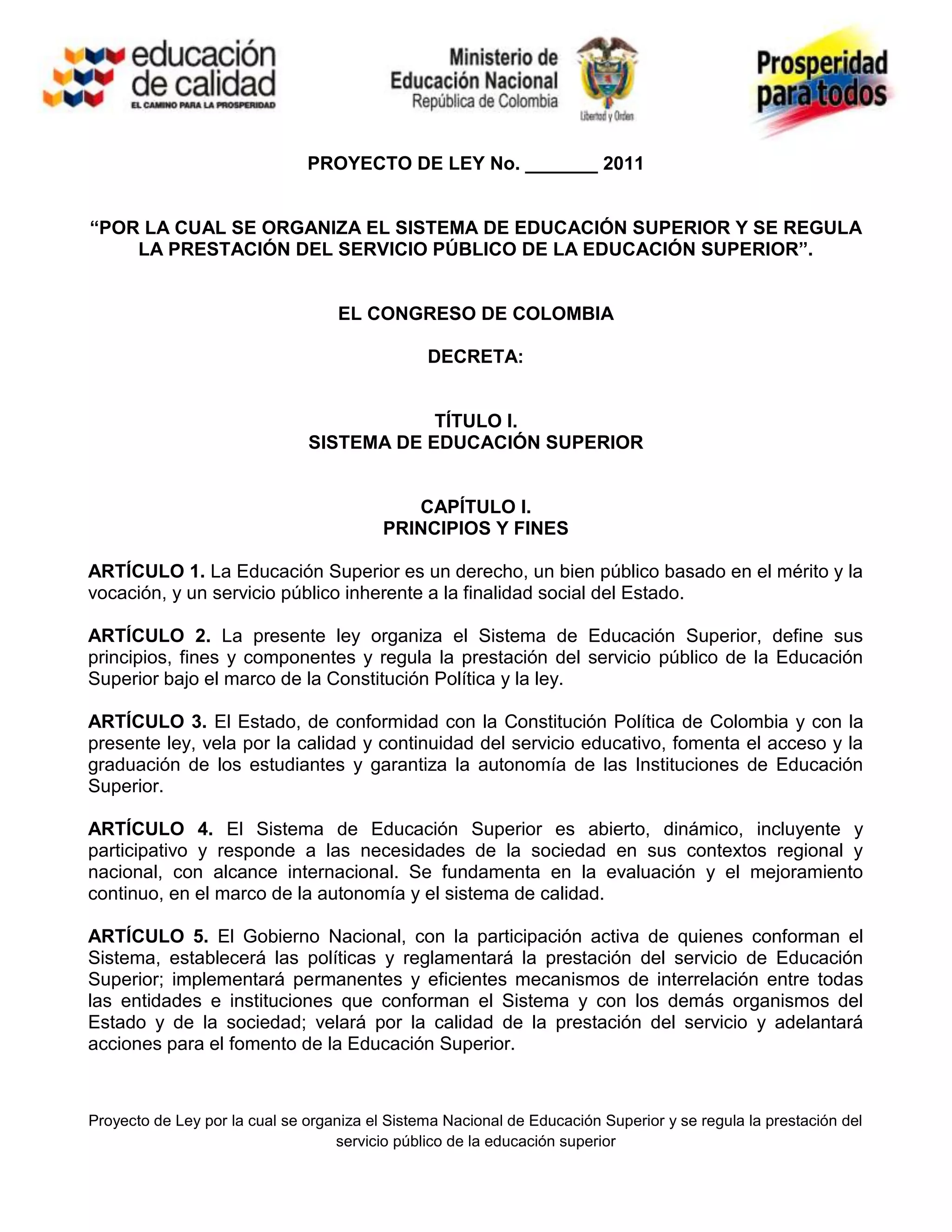 Este proyecto de ley busca organizar el Sistema Nacional de Educación Superior de Colombia y regular la prestación del servicio público de educación superior. Establece principios como la excelencia académica, la transparencia, la participación y el pluralismo. Define los fines de la educación superior como formar ciudadanos conscientes y profesionales competentes. También describe las entidades que hacen parte del sistema de educación superior y la autonomía de las instituciones de educación superior.