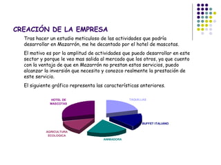 Este documento describe las diferentes fases de creación y planificación de un negocio de hotel para mascotas. En la primera fase, el autor analiza el sector y la competencia. Luego desarrolla un estudio de mercado a través de encuestas para entender las necesidades y preferencias de los clientes. Finalmente, elabora estrategias de precios, promociones y publicidad para introducir con éxito el negocio en el mercado.