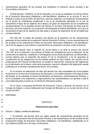 Este documento regula las características generales de las pruebas de evaluación final de las etapas educativas de Primaria, Secundaria Obligatoria y Bachillerato en España. Establece que al finalizar 6o de Primaria, 4o de ESO y 2o de Bachillerato los estudiantes realizarán evaluaciones individualizadas para comprobar el logro de objetivos y competencias. Define las competencias evaluadas, el diseño y aplicación de las pruebas, y que los resultados se comunicarán a los centros y familias para orientar el aprendizaje.