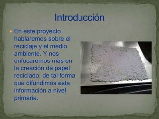 Los estudiantes realizaron un proyecto de reciclaje de papel en el que recolectaron hojas usadas, las trituraron, añadieron agua y pegamento para formar una pasta, la colocaron en moldes y la secaron al sol para crear nuevas hojas de papel. Fueron seleccionados para presentar su proyecto en una competencia y también visitaron escuelas primarias para enseñar sobre la importancia del reciclaje y el cuidado del medio ambiente.