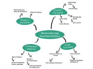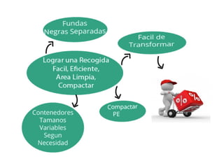 Este documento presenta varias propuestas para mejorar el reciclaje en una comunidad. Propone contenedores de basura con divisiones internas y etiquetas claras para separar los desechos en secciones para papel, plásticos, orgánicos y envases. También incluye un mecanismo para aplastar los envases de plástico y reducir su volumen antes de la recolección.