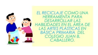 Este documento presenta un proyecto educativo que busca utilizar el reciclaje para desarrollar habilidades artísticas en estudiantes de primaria. El proyecto implementará un taller de manualidades con material reciclado y creará espacios de recolección. Se espera que los estudiantes desarrollen creatividad, conciencia ecológica y sentido de pertenencia con el medio ambiente a través de esta iniciativa.