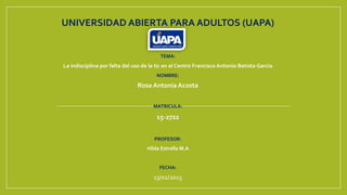 Este documento presenta un proyecto para abordar problemas de indisciplina en el Centro Educativo Francisco Antonio Batista García a través de la implementación del uso de TIC (tecnologías de la información y comunicación). El proyecto busca identificar las causas de la indisciplina, como la falta de recursos tecnológicos, y propone acciones como comprar computadoras para un laboratorio, incorporar TIC en las clases, y visitar otros centros con programas de TIC para mejorar la disciplina y el rendimiento académico.