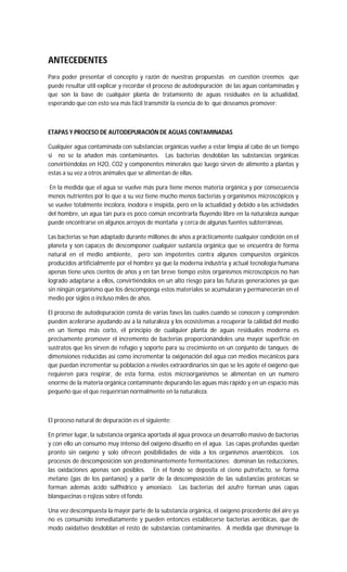 Se presenta un anteproyecto para la biorremediación del lago menor en el bosque de Chapultepec, utilizando técnicas de oxigenación y biofiltración con especies vegetales para limpiar las aguas contaminadas. Se proponen soluciones innovadoras como chinampas flotantes y gimnasio al aire libre que contribuyan a la mejora de la calidad del agua y la educación ambiental. El proyecto busca establecer un diálogo con las autoridades para llevar a cabo las acciones sin alterar el ecosistema ni afectar a los visitantes.