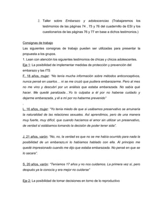 Este documento presenta un proyecto de educación sexual integral para estudiantes secundarios. Propone realizar talleres sobre temas como embarazo adolescente, métodos anticonceptivos, violencia de género y toma de decisiones. Incluye testimonios de jóvenes y consignas para analizar diferentes situaciones. El objetivo es brindar información e incentivar el debate sobre estos asuntos relevantes para la salud y el desarrollo de los adolescentes.