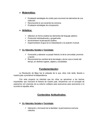 Este proyecto de 4 años de duración se centra en desarrollar la identidad nacional argentina y los eventos de la Revolución de Mayo de 1810. A lo largo de 6 días, los estudiantes participarán en actividades como escuchar narraciones sobre la Revolución de Mayo, observar imágenes de la época colonial, crear escarapelas celestes y blancas, y aprender canciones patrias. El objetivo es que los estudiantes comprendan la importancia histórica de estos eventos y valores para la construcción de la
