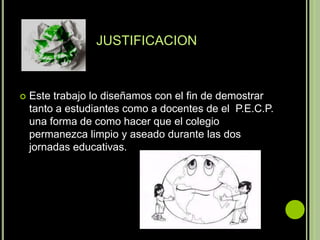 Este proyecto propone implementar el reciclaje y crear una brigada de limpieza en una institución educativa para cuidar el medio ambiente. El objetivo es mantener la sede limpia y servir de ejemplo a otras instituciones. La propuesta incluye contenedores de colores para separar los desechos y designar líderes de limpieza en cada salón.