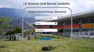 Este documento presenta las diferentes opciones de sesión para un sistema de observación escolar, incluyendo sesiones para coordinadores, profesores, invitados, personal de aseo, y estudiantes. También describe las opciones para registrar nuevos usuarios profesores y estudiantes, y realizar consultas y anotaciones individuales o grupales.