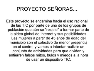 Este documento describe un proyecto dirigido a mujeres mayores de 45 años en el municipio de Villanueva de Tapia para promover el uso de las tecnologías de la información y la comunicación. El proyecto consta de varias etapas, incluyendo la presentación, difusión, y desarrollo del proyecto a lo largo de 6 meses en varias ubicaciones como el centro Guadalinfo, biblioteca municipal y escuela de adultos, con el objetivo de superar los miedos y falsas creencias sobre las TIC.