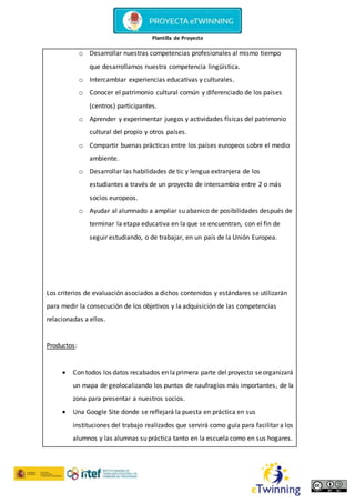 Este documento presenta una plantilla para un proyecto educativo multidisciplinar de 9 meses sobre historias de naufragios. El proyecto involucrará a estudiantes de 15-17 años de varias escuelas y países y abordará temas culturales, deportivos y medioambientales relacionados con pueblos costeros. Los estudiantes trabajarán colaborativamente en la creación de un mapa, sitio web y video final que resuman los aspectos culturales e históricos compartidos entre las comunidades costeras participantes.