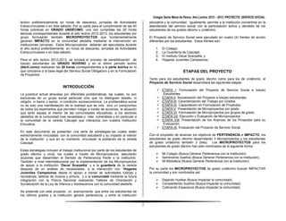 Este documento presenta el proyecto de servicio social obligatorio del Colegio Santa María de Pance para el año lectivo 2012-2013. El proyecto busca que los estudiantes de grados décimo y undécimo realicen microproyectos que generen sentido de pertenencia con la institución y que impacten positivamente a la comunidad. Los estudiantes cumplirán 20 horas de formación teórica y 80 horas de trabajo práctico a través de la formulación y ejecución de los microproyectos en la institución y en organizaciones de la comunidad