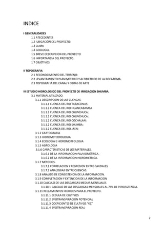 Este documento presenta el proyecto de irrigación Shumba en Perú. El proyecto consiste en la construcción de un canal principal de 86 km que captará agua del Río Tabaconas para proveer riego a 28,000 hectáreas de tierras de cultivo. El proyecto beneficiará directamente a 4,500 familias y aumentará la producción agrícola en la región. El documento incluye secciones sobre la ubicación, clima, geología, descripción, importancia y objetivos del proyecto, así como estudios topográf