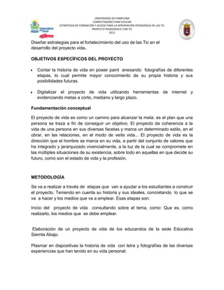 Este documento describe un proyecto de la Universidad de Pamplona para ayudar a los estudiantes de la sede Sierrita Abajo a elaborar sus proyectos de vida individuales con el apoyo de las tecnologías de la información y la comunicación (TIC). El proyecto busca que los estudiantes comprendan la importancia de desarrollar un proyecto de vida coherente y creativo que refleje sus valores y aspiraciones. La metodología incluye contar la historia de vida de cada estudiante usando PowerPoint y establecer