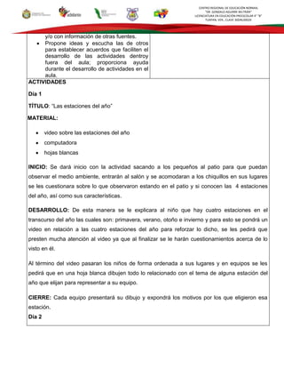 Este documento presenta un proyecto educativo de 5 días sobre la primavera dirigido a niños de 3° grado de preescolar. El proyecto busca que los niños conozcan las características de la primavera a través de actividades como la observación de la naturaleza, la visualización de un video, la creación de dibujos y recortes relacionados con esta estación y la elaboración colaborativa de murales sobre la primavera.