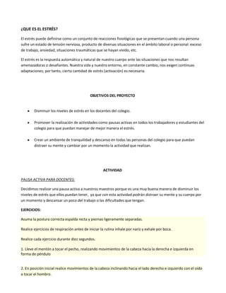 El resumen presenta un proyecto realizado por estudiantes del SENA sobre el estrés dirigido a docentes de un colegio. El proyecto buscó disminuir los niveles de estrés de los maestros a través de pausas activas que incluyeron ejercicios de respiración y movimientos corporales. Los docentes evaluaron positivamente la actividad, calificándola entre 8.5 y 9 en una escala del 1 al 10.