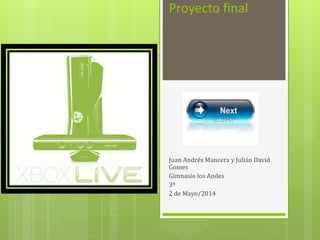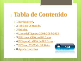 Este documento presenta la historia de las tres consolas Xbox producidas por Microsoft. Describe la primera Xbox de 2001 que utilizaba un procesador Intel Pentium III, la Xbox 360 de 2005 que ofrecía descargas a través de Xbox Live, y la Xbox One de 2013 que es la consola de octava generación y competidora de PlayStation 4 y Wii U.