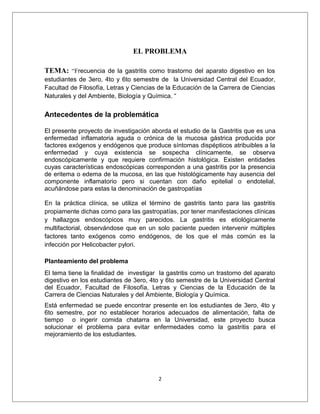 Este documento describe la gastritis, una enfermedad inflamatoria del estómago. Explica que la gastritis puede ser aguda o crónica, y que factores como la infección por Helicobacter pylori, el consumo excesivo de alcohol, y fumar pueden causarla. También detalla la anatomía y fisiología del estómago y el aparato digestivo, y los síntomas más comunes de la gastritis como dolor abdominal, náuseas y vómitos.