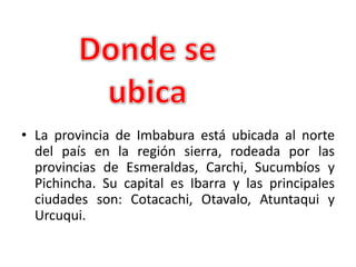 La provincia de Imbabura se ubica al norte de Ecuador. Su capital es Ibarra y sus principales ciudades son Cotacachi, Otavalo, Atuntaqui y Urcuqui. Imbabura tiene comidas típicas como carnes coloradas de Cotacachi, empanadas de morocho y choclos asados con queso. También celebra fiestas como la de San Luís en Otavalo y la de San Miguel en Ibarra. Un problema de salud pública son las aguas servidas sin tapa que propagan enfermedades.
