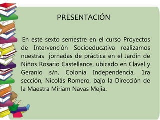 El documento detalla un proyecto de intervención socioeducativa en el jardín de niños 'Rosario Castellanos', dirigido por la maestra Miriam Navas Mejía, con el objetivo de fortalecer la práctica de valores como el respeto, solidaridad y amistad entre los niños y sus familias. Se realizaron diversas actividades, incluyendo un rally, talleres y una obra de teatro, todo orientado a fomentar un ambiente de convivencia y socialización. A través de estas prácticas, se buscó mejorar el desarrollo integral de los alumnos y la participación activa de los padres de familia en el proceso educativo.
