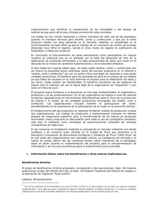 Este proyecto busca mejorar los ingresos de dos asociaciones de artesanas en Perú mediante la producción y comercialización de tejidos. El proyecto fortalecerá las organizaciones en tres áreas: organizativa, productiva y comercialización. Se capacitará a las asociadas y se dotará de maquinaria para aumentar la producción de tejidos de alta calidad basados en el patrimonio cultural de la región. Los productos se venderán a través de una tienda ecológica para mejorar los ingresos de las 176 artes