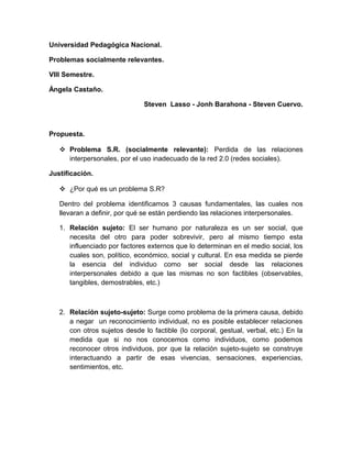 El documento propone abordar el problema de la pérdida de las relaciones interpersonales debido al uso inadecuado de las redes sociales. Identifica tres causas principales: la pérdida de la esencia individual, la dificultad para reconocer a otros individuos, y la relación excesiva del sujeto con los objetos. Su propuesta busca promover más relaciones presenciales a través de convocatorias en la red que incluyan actividades de integración social.
