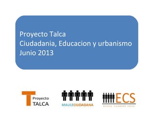 El documento presenta un proyecto para crear un Centro de Políticas Públicas (CPP) en Talca, Chile, para abordar necesidades relacionadas con el urbanismo, la educación y el desarrollo social. El CPP sería gestionado por una ONG llamada Maule Ciudadana y se enfocaría en generar propuestas en estas áreas a través de investigación, participación ciudadana y alianzas con otras organizaciones. También analiza la situación de la pobreza en Chile y la necesidad de mejorar el acceso a una educación de calidad para prom