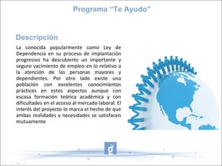 Este documento describe el Programa "Te Ayudo" en Cúllar Vega, que empareja a mujeres desempleadas con personas mayores dependientes para proporcionarles cuidados a domicilio. El programa tiene como objetivos mejorar la calidad de vida de las personas mayores, facilitar la inserción laboral de las cuidadoras, y promover el intercambio generacional. El programa ha tenido resultados positivos al satisfacer las necesidades de las personas mayores y proporcionar oportunidades laborales a 41 desempleadas de la localidad.