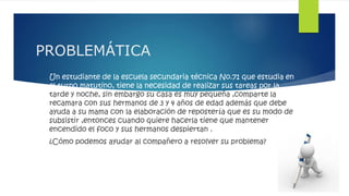 Este documento presenta tres alternativas para ayudar a un estudiante que tiene dificultades para hacer sus tareas debido a las limitaciones de espacio en su casa y la necesidad de cuidar a sus hermanos pequeños. La alternativa seleccionada implica mantener ocupados a los hermanos en un espacio separado con juguetes mientras el estudiante hace sus tareas en otra área.