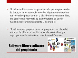 El documento describe diferentes tipos de software, incluyendo software libre y software de propietario. El software libre puede copiarse y distribuirse libremente y se permite modificaciones limitadas, mientras que el software de propietario requiere pago y no permite modificaciones. También discute copyleft y copyright. Finalmente, resume que los diferentes tipos de software satisfacen diferentes necesidades y buscan beneficiar el desarrollo tecnológico.