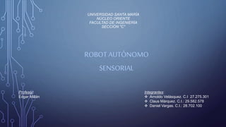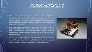 El documento describe un robot autónomo desarrollado por Julio Ernesto Rodríguez que puede navegar y evitar obstáculos de manera automática, así como ser controlado por un control remoto. Está compuesto por varios componentes como Arduino, motores y sensores que le permiten operar en modos autónomo y controlado remotamente. Se discuten las ventajas, como su versatilidad y capacidad de operar en entornos difíciles, así como desventajas, como su fragilidad.