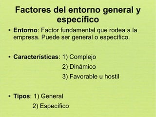 Este documento describe los diferentes factores que componen el entorno general y específico de una empresa, incluyendo factores económicos, socioculturales, políticos, legales y medioambientales. También explica métodos como el DAFO y las cinco fuerzas competitivas de Porter para analizar el entorno. Además, cubre conceptos como la localización de la empresa, su dimensión, la nueva economía incluyendo la globalización, las TIC y la ética en los negocios.