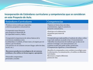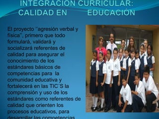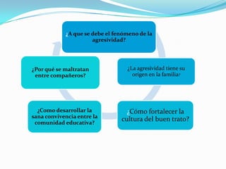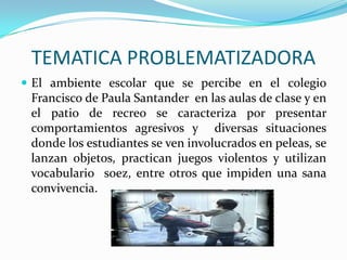 Este documento presenta un proyecto para disminuir la agresividad en el Colegio Francisco de Paula Santander a través de estrategias para promover el buen trato. El proyecto busca capacitar a los estudiantes, sensibilizar a las familias y los profesores, e identificar casos de maltrato para referirlos a instituciones de apoyo con el fin de mejorar las condiciones de vida de los niños.