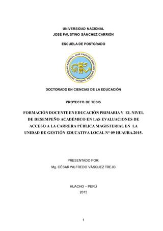 Este documento presenta el planteamiento del problema de investigación sobre la relación entre la formación docente en educación primaria y el desempeño académico en las evaluaciones de acceso a la carrera pública magisterial en la Unidad de Gestión Educativa Local N° 09 Huaura. Se describe la situación problemática sobre los deficientes resultados de docentes y estudiantes peruanos en evaluaciones nacionales e internacionales. Luego, se formula el problema general y cuatro problemas específicos, y los objetivos general y específicos de la investigación. Finalmente,