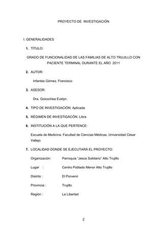 Este documento presenta un proyecto de investigación sobre el grado de funcionalidad de las familias de Alto Trujillo, Perú con un paciente terminal durante el año 2011. El proyecto analizará conceptos teóricos sobre enfermedad terminal y el papel de la familia en el cuidado de pacientes terminales. El estudio se llevará a cabo en la Parroquia "Jesús Solidario" en Alto Trujillo y analizará datos recolectados entre enero y diciembre de 2011 sobre la funcionalidad familiar con un paciente terminal. El presupuesto