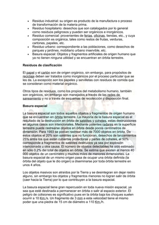 El documento define varios tipos de basura, incluyendo residuos orgánicos, inorgánicos y peligrosos. También describe la clasificación de los residuos según su origen como doméstico, industrial, hospitalario, comercial o urbano. Además, explica los problemas asociados con la basura como la contaminación y los costos ambientales, sociales y económicos de su manejo y disposición. Por último, propone soluciones como la reducción, reutilización y reciclaje de residuos para lograr un manejo más sostenible.