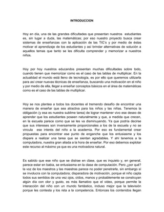 Este documento describe las dificultades que tienen los estudiantes del grado 2° con las matemáticas, especialmente con las tablas de multiplicar. Propone utilizar la tecnología y herramientas computacionales para motivar a los estudiantes y mejorar su aprendizaje y rendimiento en matemáticas. El objetivo es encontrar nuevos métodos de enseñanza que sean atractivos para los niños y les ayuden a comprender y apropiarse de conceptos matemáticos básicos como las tablas de multiplicar.