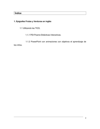 El proyecto busca desarrollar un aprendizaje significativo de las frutas y verduras en inglés en niños de primero a tercero básico a través del uso de las TIC. Se utilizarán pizarras interactivas y software educativos para que los estudiantes interactúen con imágenes y relacionen los conceptos en inglés. El objetivo es que los niños reconozcan y hablen sobre las frutas y verduras diarias en otro idioma de manera lúdica y significativa.